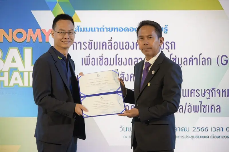 ในงานสัมมนา “การขับเคลื่อนองค์กรเชิงรุก เพื่อเชื่อมโยงตลาดสู่ห่วงโซ่มูลค่าโลก (Global Value Chain) และมุ่งสู่สังคมคาร์บอนต่ำ ด้วยมาตรฐานสากลด้านเศรษฐกิจหมุนเวียนและเทคโนโลยีรีไซเคิล/อัพไซเคิล”
